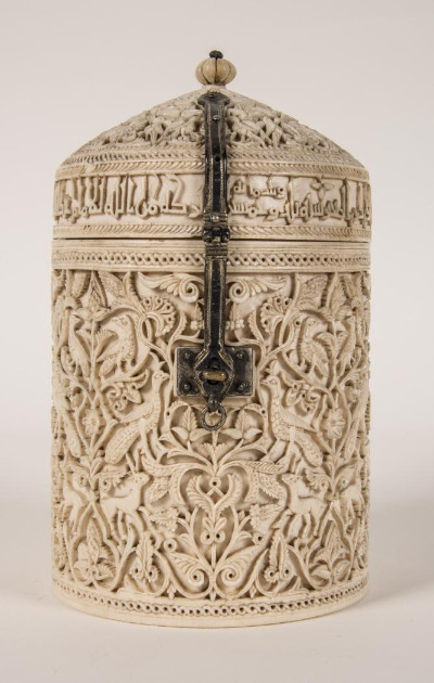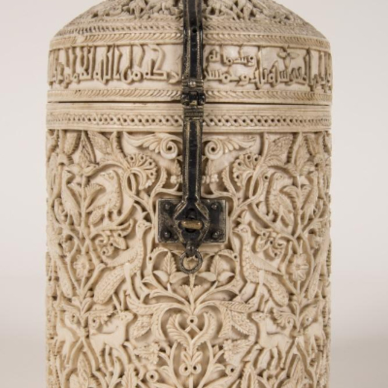 Arqueta cilíndrica encargada por Alhaquen II para una favorita, según se indica en la inscripción. Es cilíndrica y tiene tapa cónica que se articula y cierra con bisagra y broche de plata nielada. Toda la superficie de la pieza está cubierta con decoración de ataurique de hojas dentadas, digitadas y anilladas y palmetas, entre las que se intercalan en disposición afrontada pavones, gacelas y otras aves. La decoración se halla enmarcada por cenefas de cordoncillo. La talla es muy delicada, acusando fuerte claroscuro.