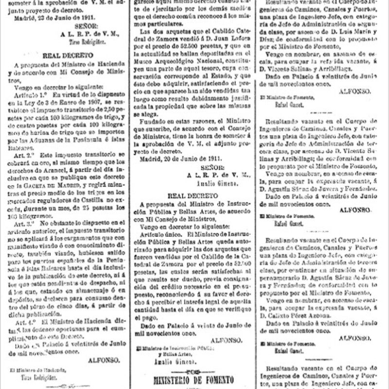 Real Decreto de 20 de junio de 1911 autorizando la adquisición de dos arquetas que fueron vendidas por el Cabildo de la Catedral de Zamora