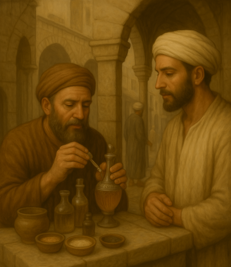 Muchos de estos compuestos cosméticos y terapéuticos, como bálsamos, ungüentos, lociones y colonias, se preparaban en las farmacias, la más célebre de las cuales era la farmacia (Jizanat al-adwiya) de Medina Azahara (Holob, 1992). Aunque también existían perfumistas que trabajaban para clases más modestas, en plena calle, donde preparaban un perfume o una loción, a la vista del cliente (Greus, 1988).